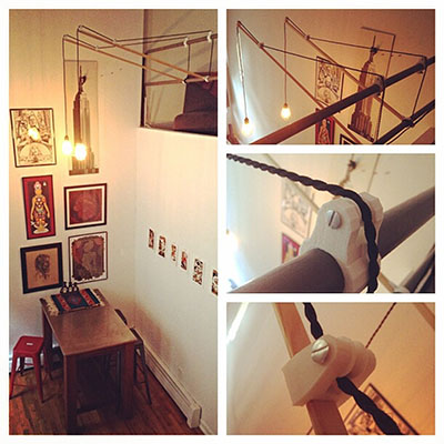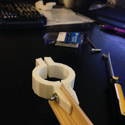 它看起来像一个MakerBot 3D打印机是他创造作品的首选技术。 他只花了几个小时,模型,和测试新的方便的照明系统,他最终以滑轮和三种括号结束。 一架在栏杆上,中产承重轮的一个是,一个是结束夹。 他购买木制L截面桅杆在当地一家艺术用品商店。 他也购买钢垫圈、螺栓和螺母在当地五金店。 不仅是他让自己的照明系统,但他是支持当地小零售商。 所有涉及到的似乎是一个双赢的局面!