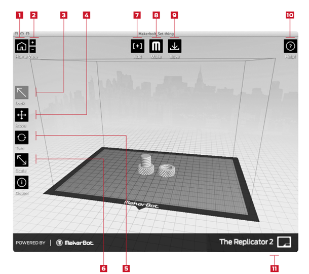 [11] STATUS BAR(状态栏): 显示MakerBot Replicator 2 连接的状态。