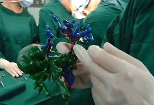 由于肝脏内部管道纵横交错,要想从这些纵横交错的管道中,把肝脏某些外来物质切除掉是一件十分复杂的事情。由于CT和核磁都是二维影像,要把二维影像转变成三维影像,原来都是靠医生自己的想象和判断。不过现在可以通过3D打印技术形成三维影像,从而直观的判断中肝脏的内部结构,根据影像进行精确的手术方案设计。