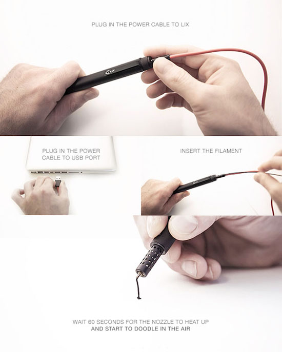 其实我们要想画出这些物体,只需把笔与电脑相连完成充电,随后在把细丝线的塑料插入笔的内部。这样一来,细丝状的塑料经过笔下端的喷嘴加热后,就会变成液态流出,在遇到空气冷却后,一个个立体结构就形成了。当然在结构刚刚成型的时候,我们最好在等上几秒钟,这样在结构冷却下来后就会更加牢固些。 事实上这并不是世界上首支3D打印笔,但目前来看他的体积最小重量也最轻。