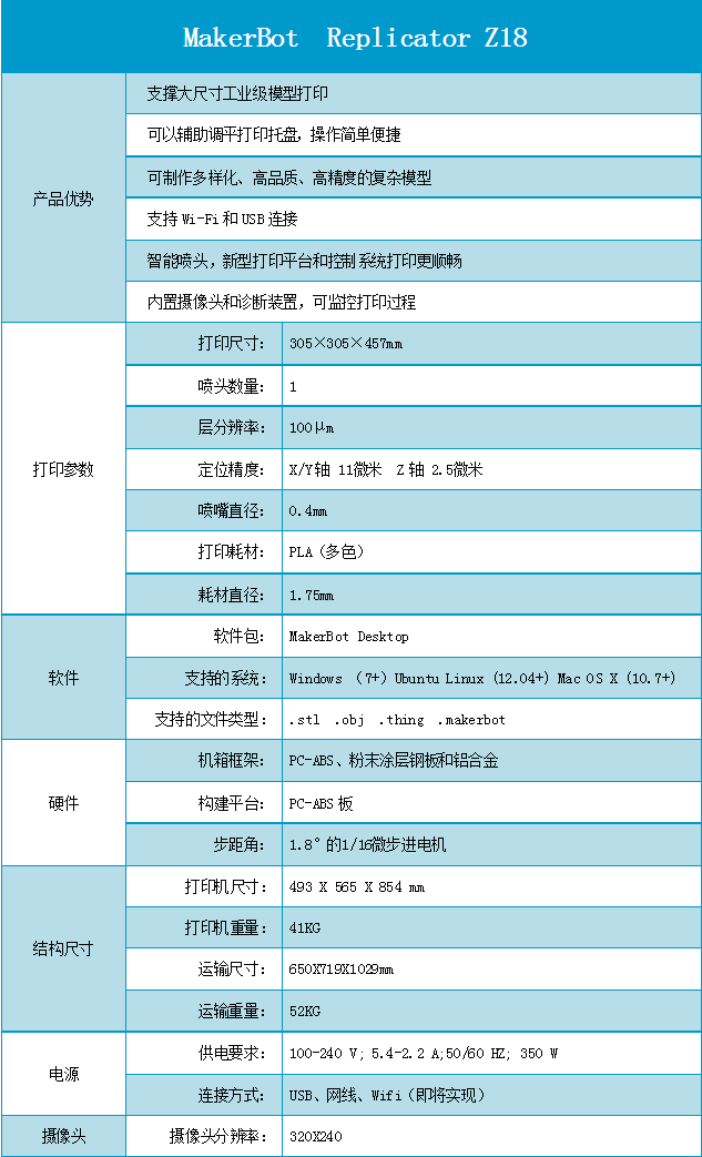 MakerBot公司是Stratasys公司旗下全球领先的生产桌面级3D打印机的公司,MakerBot Z18是MakerBot公司在2014年1月推出的一款大尺寸桌面级3D打印机,该款产品具有以下特点: